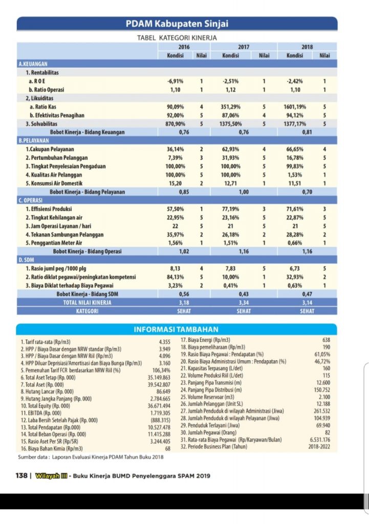 Terdapat 4 kriteria atau kategori untuk penilaian ini, yaitu keuangan, pelayanan, operasi, dan Sumber Daya Manusia (SDM). Kali ini untuk pada nilai yang dicapai Kabupaten Sinjai, di aspek penilaian keuangan mencapai 0,81, pada aspek pelayanan 0,70, operasi 1,16, SDM 0,47, total nilai yang didapatkan Kabupaten Sinjai yaitu 3,14 sehingga ini masuk dalam kategori sehat.